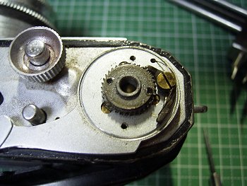 巻き上げ不動のため軍艦部を開けました。こんな単純なラチェットです。 固着しているようで、ギアのカニ目を回しても回りません。 ベンジンを指して時間を置いたら外れました。予想通り、ネオカに多い、逆ねじでした。 巻き上げ機構を分解して、部品を洗浄して組みなおしたら改善しました。