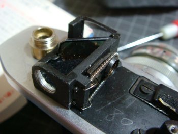 ![]() ヘリコイドがまったく動かないPAX M2のレストアです。 軍艦部を外してみました。シンプルな距離計ですが、二重像調整方法が個性的です。 このスプリングで固定されたレンズの角度を、小さなネジ2本で調整する方法です。 |