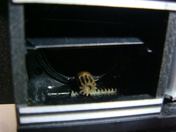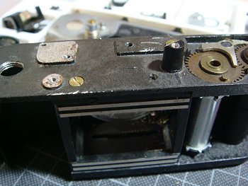 ![]() 巻き上げ動作をすると下のカムが平行移動し、連動したギアでシャッターがチャージされる。 鏡胴と本体を組み合わせる時、このようなギアとカムの組み合わせは、調整が大変になるものです。 幸いにも、問題なく動作しました。 |