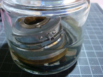 ![]() 最終手段。レンズを外してアセトンに一晩漬け置きです。古いグリスが下に沈殿し、翌朝にはヘリコイドが回転するようになりました。 これを数回繰り返し、新しいグリスを少し塗って完成です。シャッターや絞りも正常です。 |