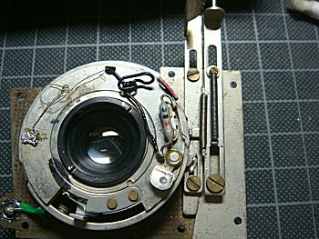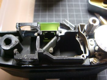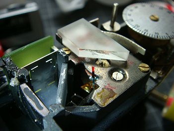 ![]() 大変、珍しい機種のレストアです。台形のプリズムは、明り取り窓から 入った光により、赤色指針をファインダーに投影するためのものです。 露出計指針も、シャッターもまったく動きません。 |
