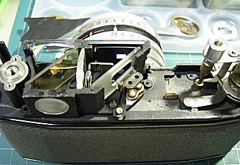 グリーンではなく、ブルーのファインダー を持つペトリのレストアです。汚れいてる ファインダーをクリーニングします。露出計 がないので、スペースに余裕があります