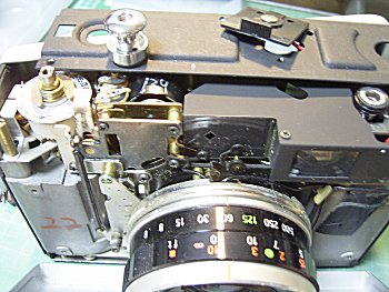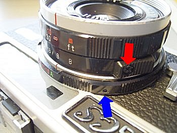 距離計二重像が動かない状態です。軍艦部を開けた いのですが、このリコー500シリーズはモナカ構造で軍 艦部を開けるのに前面パネルを外す必要があります。 まず、外皮を剥がして前面にあるねじを4本外します。 続いて、赤矢印のシャッター速度リングつまみを 2個外します。最後に、青矢印のねじを3本外して、 絞りリングを外すことで、前面パネルが外れます。