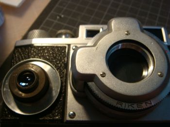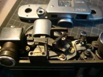 軍艦部を開けると距離計機構が見えます。しっかりとした部品で作られています。 ファインダーをクリーニングする際、ハーフミラーを擦ると蒸着面が剥がれるので十分な注意が必要です。