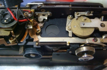 リコーの110カメラ。CdSコイル式の露出計を搭載した珍しい110カメラ。内部は機械式カメラそのもの。 シャッターのはずみ車が軸から外れていた。