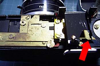 サモカの中でも珍しい機種のレストアです。欠損 している巻き戻しクランクは代用品を付けました。 写真の赤矢印が露出計指針を押える段カム。軍 艦部全体に広がる大きな金属板が右に移動して 露出計指針を挟み込む仕組みになっています。