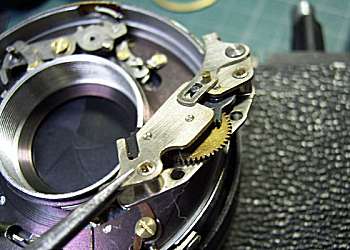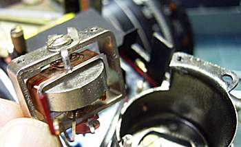 露出計コイルが回転軸から外れている。ゼンマイ や配線が切れないように、細心の注意をして組み 込みます。何とか成功、コイルが動き出しました。