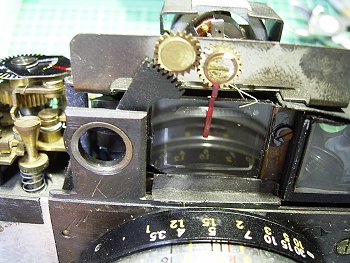 タロンアイといえば、大きな軍艦部が特徴ですが、内部はこうなっていました。 露出計コイルがあり、ギアとカムで、絞りリングと連動しています。ギアの組み合わせ 位置の調整が面倒ですので、分解には注意が必要です。