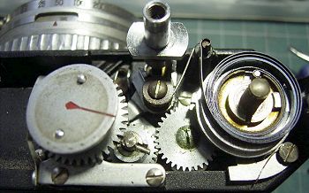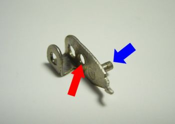 写真の青矢印はシャッター羽根穴に差し込まれる部 分です。赤矢印部分の穴にリベットがあるはずです が欠損しています。シャッター内部を探したら、2mm 程度の小さなリベットが落ちていました。その頭が 斜めになっています。シャッターがチャージする時 はカムを押し、戻すときには、すり抜ける仕組みで す。角度を確認して、リベットを接着して完了です。 不動の原因はこれでした。シンプルなだけに、からく りの謎を解かなくてはならないシャッターでした。