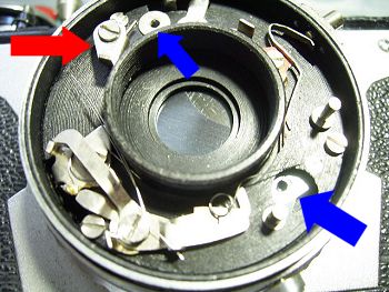 次にシャッターを分解しました。上部青矢印に付い ていたシャッターチャージ用の長いアームを取り除 いた状態です。下の青矢印がシャッター羽根穴です シャッター速度は、なんと赤矢印のテンションの みで制御しています。どうもシャッターチャージが うまく動いてくれません。観察して推理してみます。