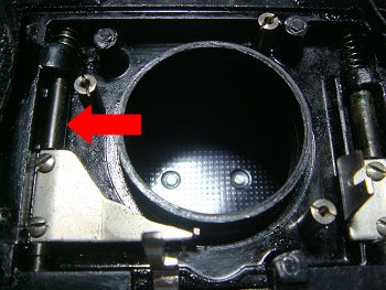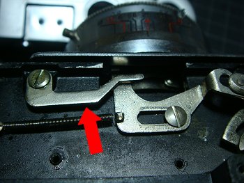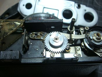 ![]() 距離計に不具合があるようで、二重像の動きが粘っています。 早速、軍艦部をあけてみました。部品の工作精度はあまり高くなく、 距離計調整も簡素なものです。 |