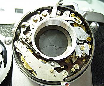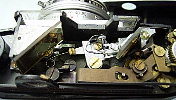 軍艦部です。距離計やファインダーが見えます。 シンプルですが、しっかり作ってあります。 固着したカムはベンジンできれいにしました。