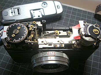 露出計不動のミミーです。早速、この小さなカメラの軍艦部を開いてみました。