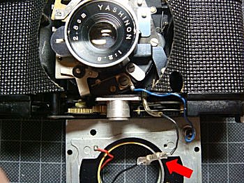 鏡胴からセレン電池裏を覗いたのですが、抵抗器が見当たりません。仕方なく、レンズボードを外したら見つかりました。(赤矢印) この抵抗を取り除くことで、若干反応が弱いものの露出計指針が振れ始めました。