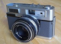 発売年:1961年レンズ:ROKKOR 45mm/F2.8 サイズ:133×80×72mm シャッター速度:EV6(1/8秒F2.8)〜EV18(1/1000秒F16) 重量:約700g 電池:セレン光電池 当時価格:16500円 距離計連動式プログラムEEカメラ。軍艦部に追針式露出計メーターがある。露出計指針(赤色)に、鏡胴リングを回して緑色指針を合わせることで、 適正露出を得られる。ファインダーが中央部に、距離計窓が正面右側にある。 背面には、フラッシュガイドテーブルが書いてある。分割(小刻み)巻上げが可能。 |