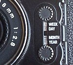 発売年:1978年レンズ:YASHICA LENS 38mm/F2.8 サイズ:125×75×53mm シャッター速度:1/60秒〜1/360秒 重量:約380g 電池:単3乾電池 2個 当時価格:36800円 ポップアップストロボ付きプログラムEEカメラ。ゾーンマーク目測式で距離計はない。ファインダー内に絞り値が指針表示される。電池はストロボと露出計共用。電池が無いとシャッターは切れない。セルフタイマー付き。前面のダイヤルで日付(年月日および曜日)を設定できる。レンズはYASHINONではなくYASHICA LENS。 |