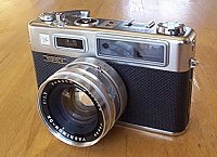 発売年:1966年レンズ:YASHINON-DX 45mm/F1.7 サイズ:140×82×74mm シャッター速度:B・約30秒〜1/500秒・ストロボ使用時1/30秒 重量:約740g 電池:HM-4N型水銀電池 1個 当時価格:23,200円 絞り優先EE距離計連動式カメラ。ICを内臓し、絞り優先EEを実現した国産電子シャッターカメラ1号機。大ヒットとなるエレクトロシリーズの初代カメラ。「ロウソク1本の光でも写るカメラ」と宣伝されたYASHINON-DX 45mm/F1.7のレンズを持つ。軍艦部にあるLEDで露出警告を表示する。赤ランプは露出オーバー、黄ランプば手ぶれ警告を示す。 |