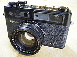 発売年:1970年レンズ:COLOR YASHINON-DX 45mm/F1.7 サイズ:140×82×74mm シャッター速度:B・約30秒〜1/500秒・ストロボ使用時1/30秒 重量:約730g 電池:HM-4N型水銀電池 1個 当時価格:33800円 絞り優先EE距離計連動式カメラ。同年発売のGSゴールドメカニカのブラック仕上げ。解像度や周辺光量が増したCOLOR YASHINON-DX 45mm/F1.7のレンズを持つ。軍艦部にあるLEDで露出警告を表示する。赤ランプは露出オーバー、黄ランプば手ぶれ警告を示す。ボディー前面にはGTのロゴがあるが、レンズがYASHINONであればGT、COLOR YASHINONXであればGT(S)である。 |