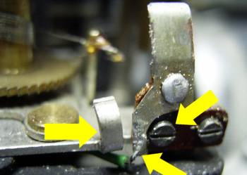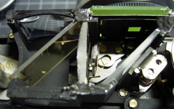 ![]() | 続いて露出計不動の原因を探ります。この露出計、のこぎり刃の付いている黒い円筒が、レリーズボタンと共に降下する仕組みです。ペトリらしい機構です。露出計にテスターで電圧をかけたところ、指針が触れました。露出計は生きているようです。後は、断線か接触不良、セレンの劣化でしょうか。 |