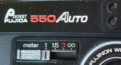 | 110型ストロボ内蔵プログラムEEカメラ。距離合わせはカメラ前面にあるスライドスイッチを調整することで、ファインダー内にピクトグラム指針表示される。 本機種は、前年に発売になったPOCKET FUJICA 450 FLASHにCdSによる露出計を付加してプログラムEEを実現した高級機。露出不足の際は、レリーズボタン半押しで ファインダー内に赤色LEDが点灯する。レンズはフジノンワイド3群4枚構成。使用フィルムはカートリッジ式110フィルム。 |
