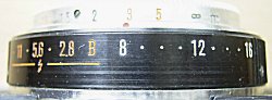 橙色数値はフラッシュ撮影用絞り値で、この場合、シャッター速度は1/30秒固定となる。シャッターはCITIZEN-LB。1964年にはスペックアップしたREPO-S