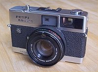 発売年:1974年レンズ:C.C.PETRI 40mm/F1.7 サイズ:133×78×56mm シャッター速度:2〜1/1000秒 重量:約520g 電池:HM-N(NR52)型水銀電池 2個 当時価格:33000円 プログラムEEの距離計連動式カメラ。PETRI自社製のシャッターではなく、SEIKO-ESFシャッターを搭載。ESは、ELECTRONIC SHUTTERの略。背面にあるA-F切り替えスイッチは、A位置では通常プログラムEEモード、また、ストロボ装着時はオート発光になる。F位置では、ストロボ装着時、強制発光。マニュアル絞りが使用できる。速度リングにある、アルファベット表示は、フラッシュマチック用のガイドナンバー(GN)。背面に貼ってある対応表に合わせて設定する。ファインダー内には、絞り値等の表示はない。 |