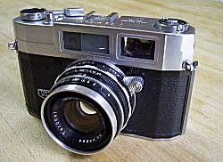 発売年:1958年レンズ:TARONAR C. 45mm/F1.9 サイズ:132×81×69mm シャッター速度:B・1〜1/500秒 重量:約700g 電池:なし 当時価格: 距離計連動式カメラ。日本光測機工業株式会社(東京都大田区大森)製。露出計のない、完全マニュアル機。同年9月にはF2.8付の機種が発売になった。巻き戻しクランクは、引き出し棒によるユニークな機構を持っている。明り取り窓があるブライトフレーム付きファインダーを持つ。底部にはフィルム感度表示プレートがある。 |